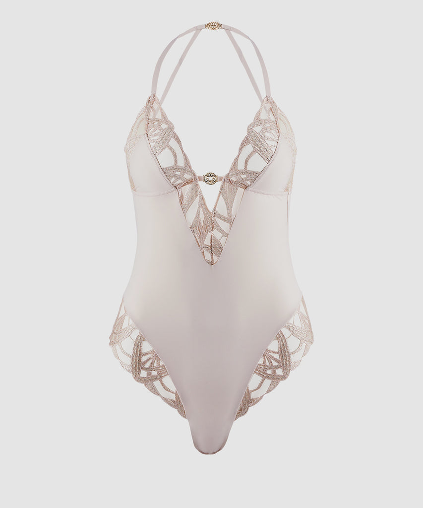 Aubade has collaborated with Ellie Saab to create this most eye catching collection. Infused with shimmering golden lurex embroidery and contrast with sheer tulle. Plunging neckline with a small jewel in the centre. Soft stretchy fabric.