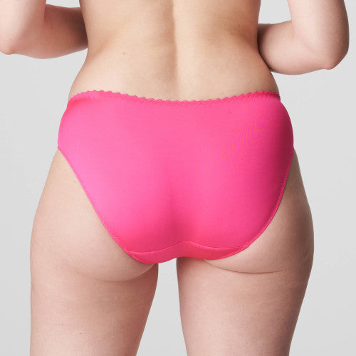 Rio briefs with a trendy retro look. With chic embroidery on the front and soft satin fabric on the back. Trendy fluorescent pink: a seductive color that allows your femininity to shine.