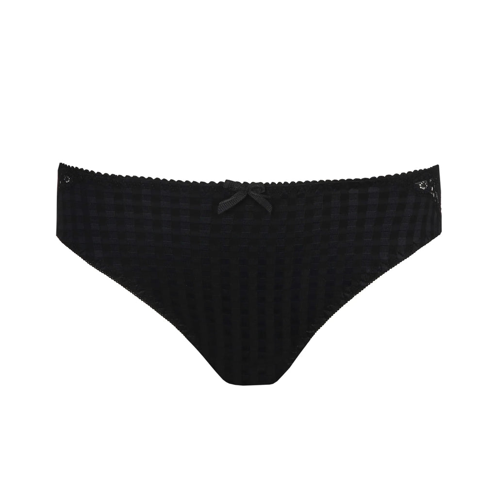 Playful Rio briefs in a checked fabric, luxuriously finished with stretch lace all the way to the back. Mysterious, feminine, strong: Black has it all.