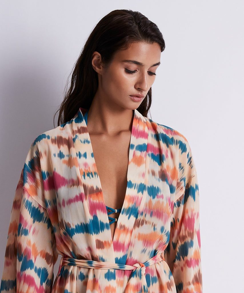 The Evening Sand kimono is light and floaty with a detachable belt, loose-fitting sleeves. This understated kimono is made from unbelievably sensual sheer voile that nestles against the skin, creating a look that is seductive as well as sophisticated.