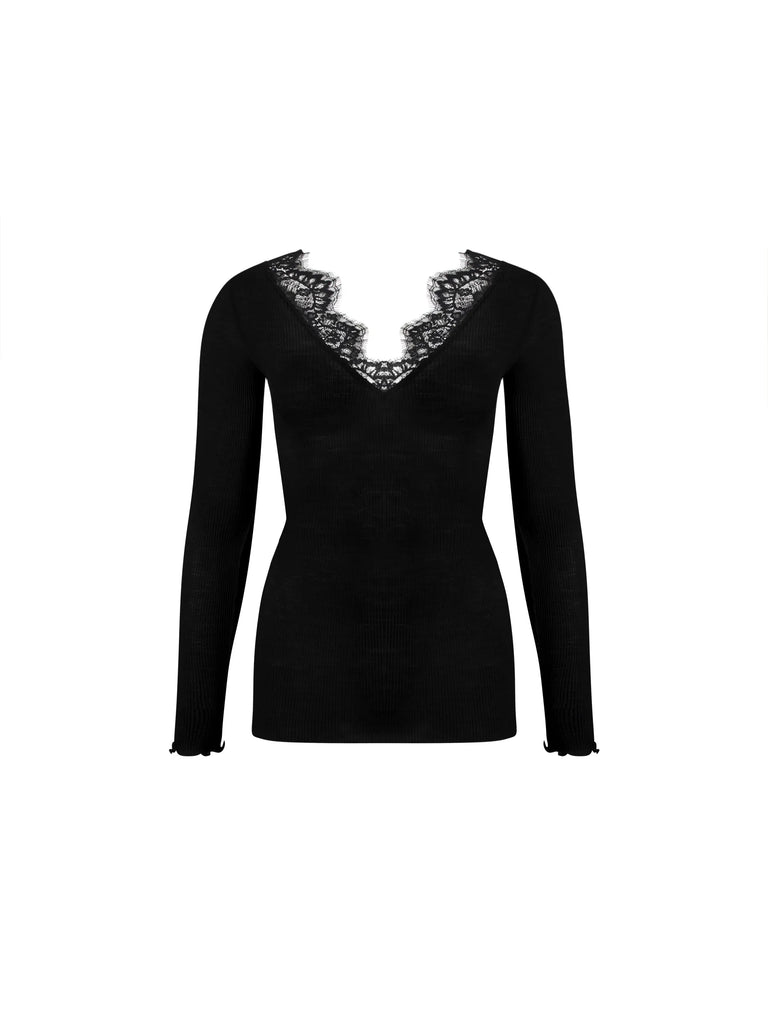 This fitted rib style v-neck top can be worn as a lounge wear or ready-to-wear piece. Long-sleeve top in tubular knit with lace incrustation on front cleavage.