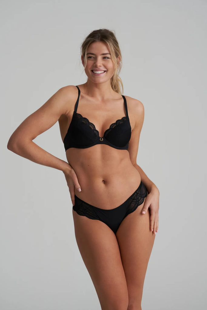 A seductive look and an unrivaled fit: This lace thong offers the best of both worlds. This thong is cut exceptionally high at the legs, leaving your bottom fully uncovered. Seductive with a hint of mystery and always on-trend: black is the perfect color for these minimalist sets.