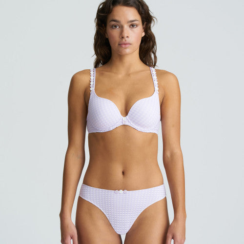 Pre-shaped padded bra with heart-shaped cups. The straps can be worn over the shoulders or around the neck (except for the colour ‘Tiny Iris’). The straight back with silicone band provides extra support. Tiny Iris captivates with elegant lilac and white checks.