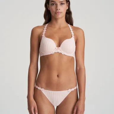 Pre-shaped padded bra with heart-shaped cups. The straps can be worn over the shoulders or around the neck . The straight back with silicone band provides extra support.