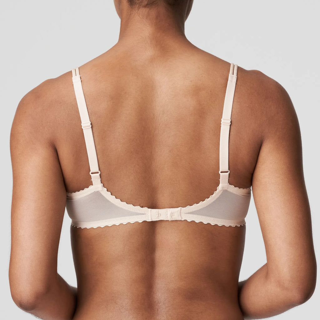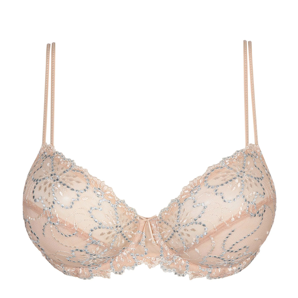 This balcony bra is incredibly flattering. This particular style is slightly more revealing and features richly embroidered cups with full coverage. Delicate shoulder straps complete the look. Pale Peach is a subtle sand like colour with a high-gloss finish.