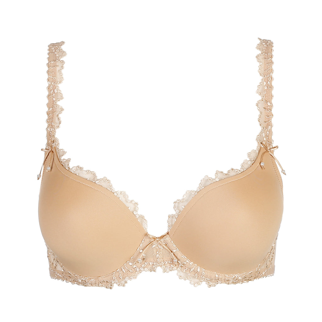 The ever popular Jane padded heart shape bra creates a beautiful cleavage. The cup plunges in the center and rises up on the sides to support the curve of the breast. The delicate embroidery that lines the top of the cup and on the multiway straps creates the perfect fit. This is a great t-shirt bra.