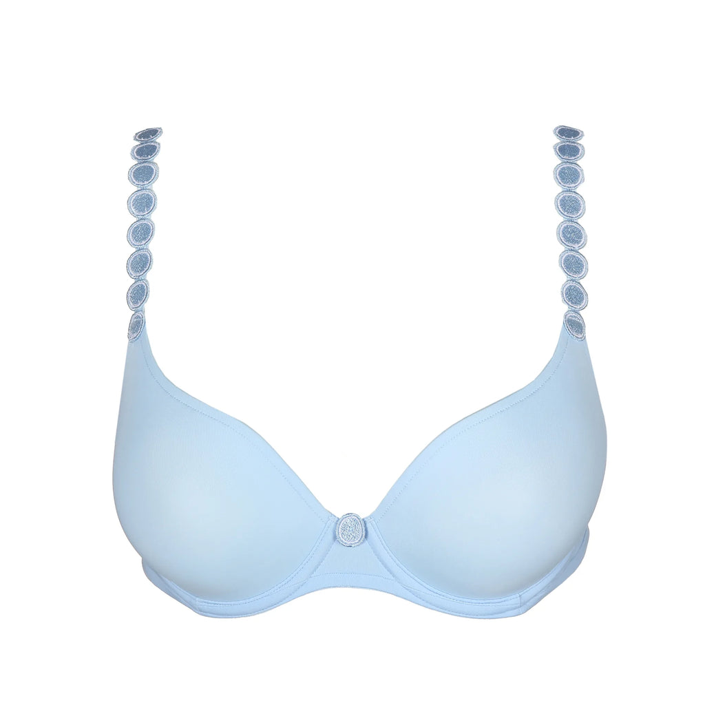 A padded bra with heart-shaped cups. The cups offer excellent coverage at the top. The bra is cut high on the upper cups and then plunges into a deep neckline between the breasts. The sheer tulle on the back is cut straight. The straps can be worn over the shoulders or around the neck.