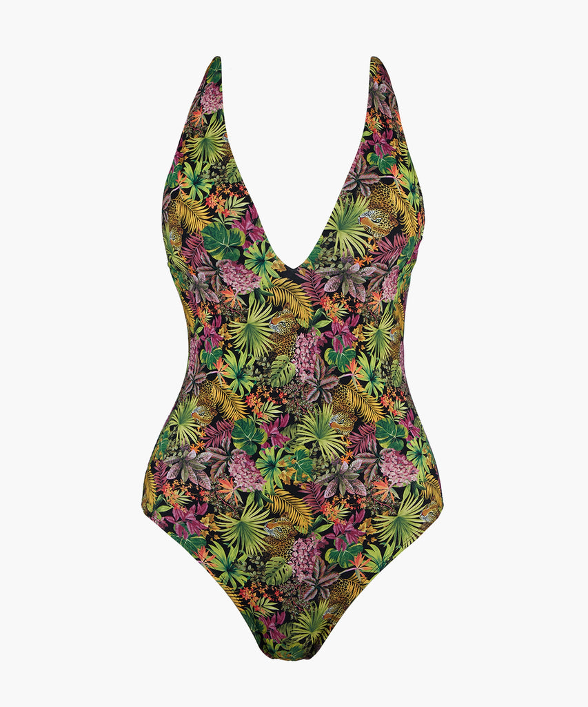 With its ultra-plunging neckline for an irresistible, visually striking effect and its sexy back with a cut-out extending down to the small of the back. Made entirely from soft and comfortable recycled fabric with an exclusive tropical print, it has wide straps and eye-catching bands across the back with a gold-coloured clasp for maximum support. Its modern style means it goes perfectly with trousers, shorts or a high-waisted skirt for an elegant, sensual, sun-kissed summery look.