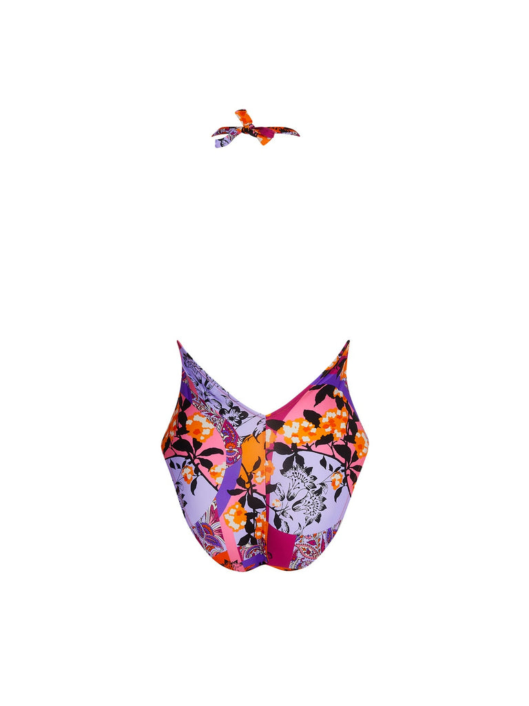 Original Plunging non -padded V-Neck Swimsuit – Designed to define and refine the silhouette with effortless elegance. Made from luxurious printed microfiber, this swimsuit features a signature placed pattern at the front for a striking look. The deep V-neckline at both the front and back enhances femininity, while the lined front and elastic under-bust band provide subtle support. The halter-neck straps finished with gold-finished rings, adds a refined finishing touch to this sophisticated swimwear piece.