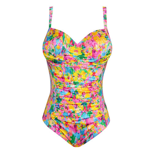 Ubud full cup underwired swimsuit in a vibrant print. Multiway straps with ruching on the front of the swimsuit