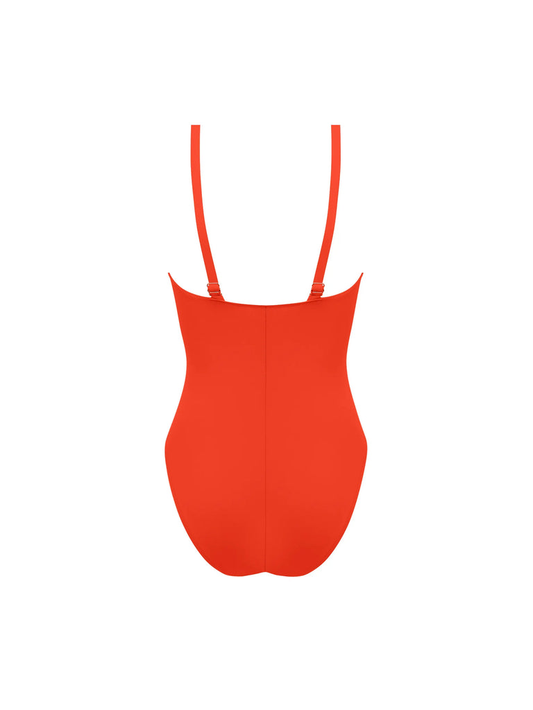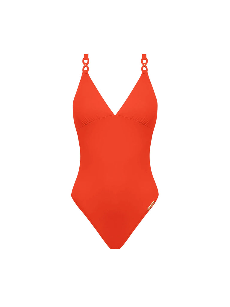 Non-Wired Halter Neck Swimsuit – A perfect blend of comfort and elegance. Crafted from plain luxurious microfiber, this swimsuit offers a flattering, supportive fit with an elastic under the bust. The lined cups provide a smooth and seamless look, while the adjustable halter straps ensure a personalized fit. A textile jewel detail, featuring interlaced rings with a subtle gold accent, adds a refined touch. Designed for effortless sophistication, this piece is ideal for both lounging and swimming in style.