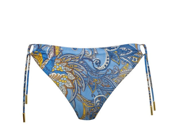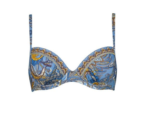 Underwire bikini top with padded cups. Straps adjustable in length, removable in the back for variable wearing options. Clip fastener back. Lush paisley motifs with sumptuous placed borders.