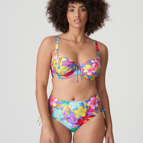 This full cup bikini top is a colourful, floral beauty. The multiway straps can be worn over the shoulders or around the neck. Blue Bloom is a mix of bright blue, sunny pink, and orange with fluorescent details.