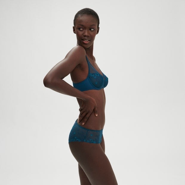 Floral embroidery, enhanced by delicate guipure lace designs. Embroidered non-padded mesh triangle bra with underwire, offering excellent support. An enveloping triangle shape with a plunging neckline.