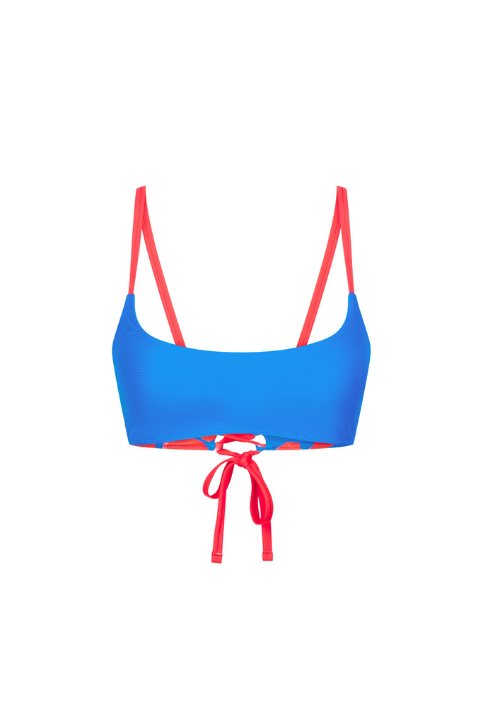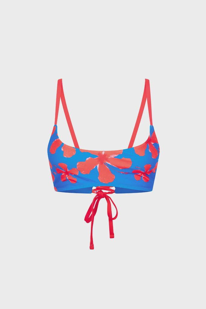 Ride the waves or soak up the sun in this bold and versatile surf-style bikini top. Featuring a vibrant hibiscus print in fiery red and cool ocean blue, this top brings tropical energy to your beach look.