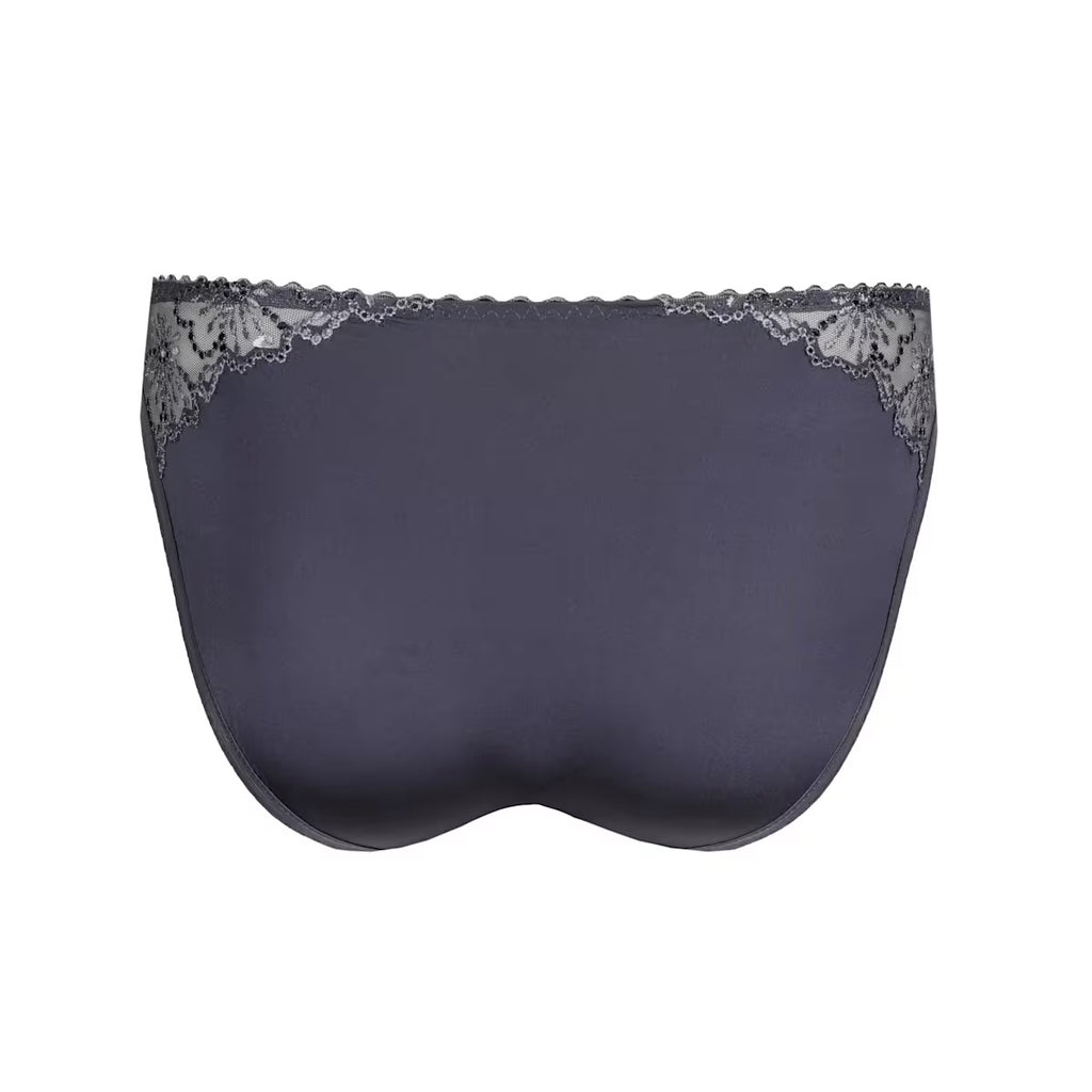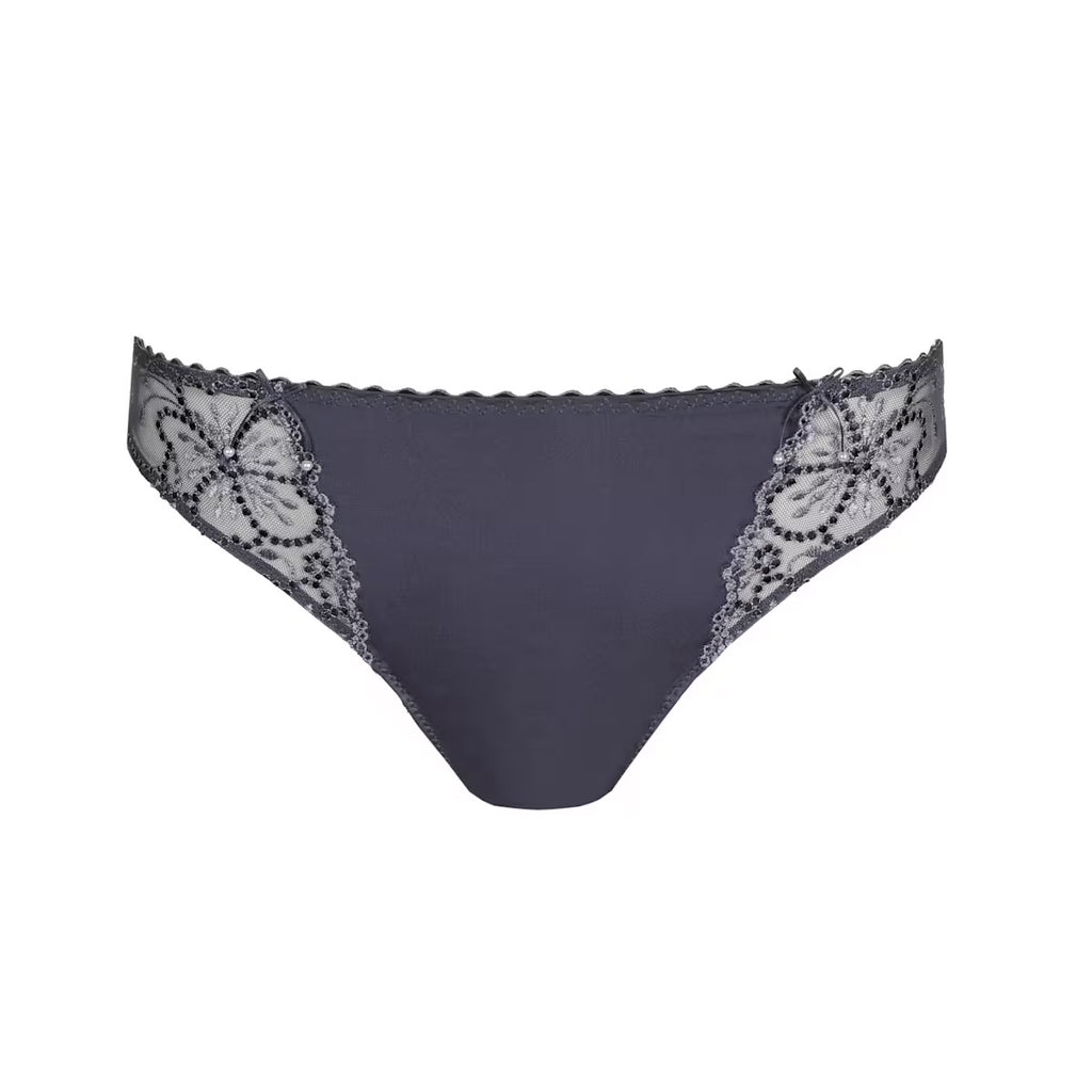 The embroidery runs beautifully over your hips and highlights the delicate cut of the Rio briefs. Elegant and mysterious in muted blue.