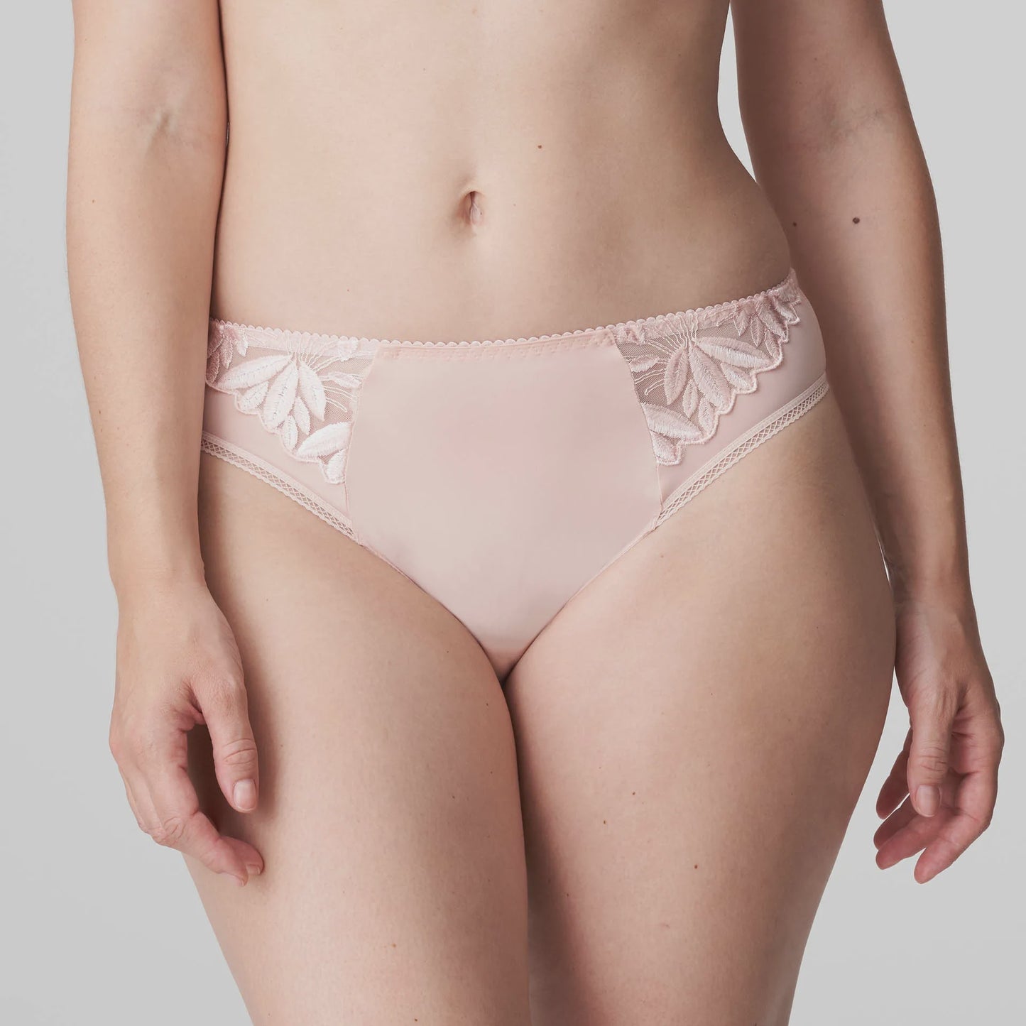 Opaque briefs with chic embroidery on the legs. The perfect summer set: Pearly Pink, an understated shade of white that captures the light with a beautiful print.