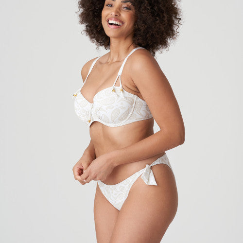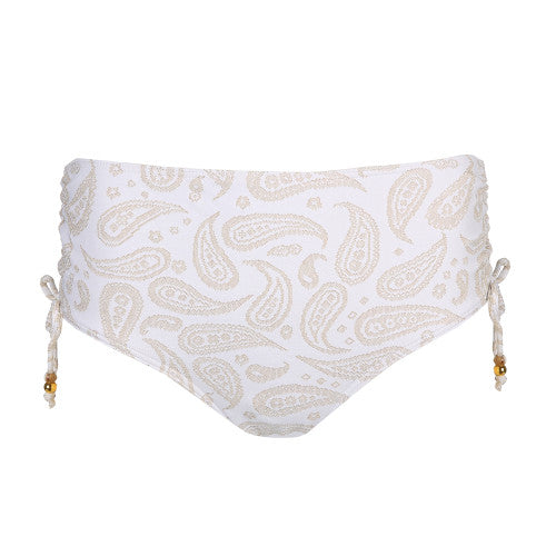 High-waisted bikini briefs made from jacquard fabric. Decorative pearls and gold on the adjustable side ties. White Yacht is a soft ecru with a golden paisley print: light, summery, and very chic.